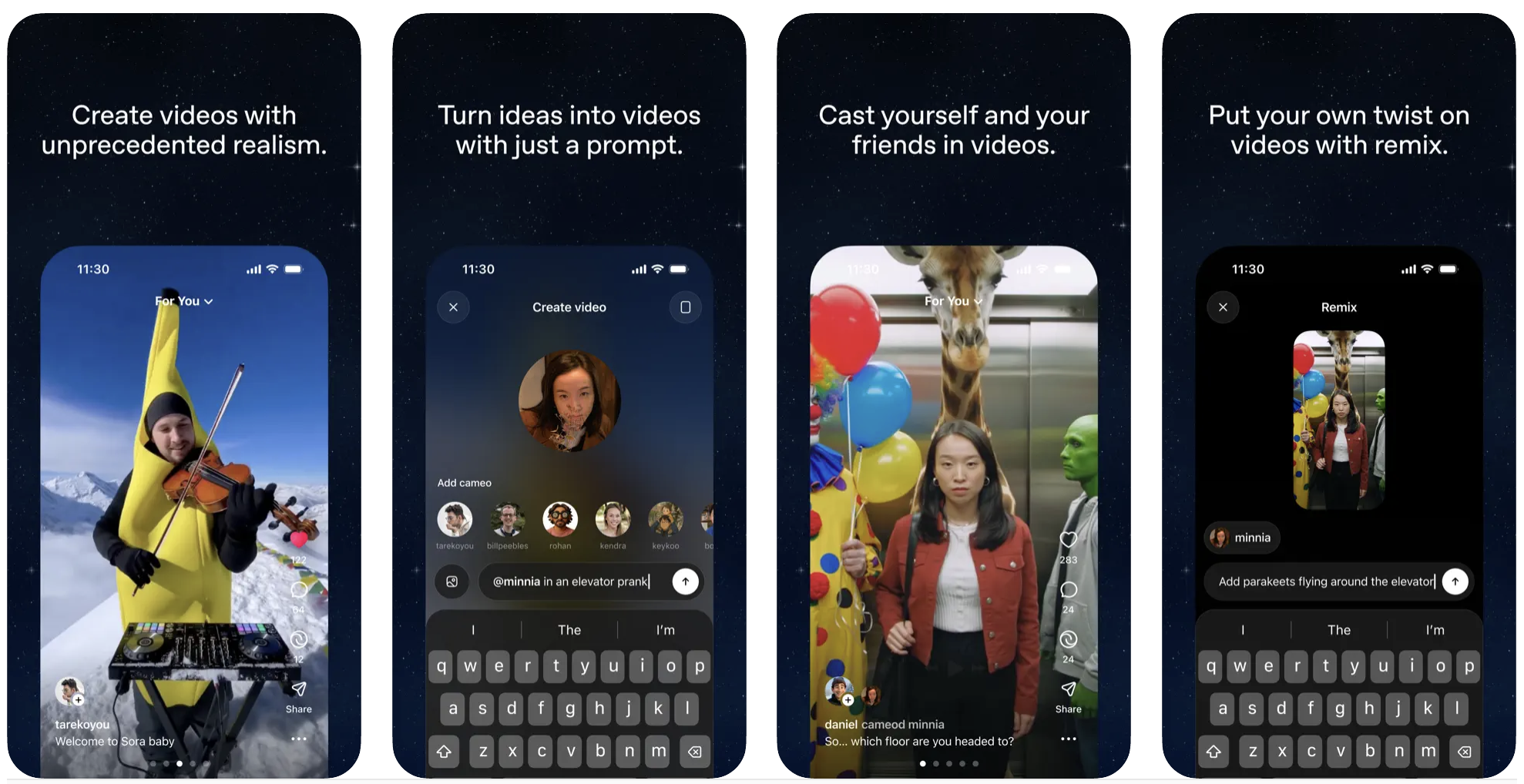 แอป Sora ใช้โมเดล Sora 2 และยังจำกัดการใช้งานแบบ invite-only ในสหรัฐฯ และแคนาดา หน้าตาการใช้งานโดยรวมคล้ายแอป TikTok ซึ่งความน่าสนใจของแอป Sora คือ นอกจากเราจะเขียน prompt เพื่อสร้างวิดีโอได้แล้ว เรายังสามารถแทรกวิดีโอหรือหน้าของเราเข้าไปอยู่ในฉากและเสียงที่ AI สร้างขึ้นได้ หรือให้ AI ต่อเติมแบกกราวด์ หรือฉากที่เราอยากเข้าไปอยู่เป็นส่วนหนึ่งในนั้น
