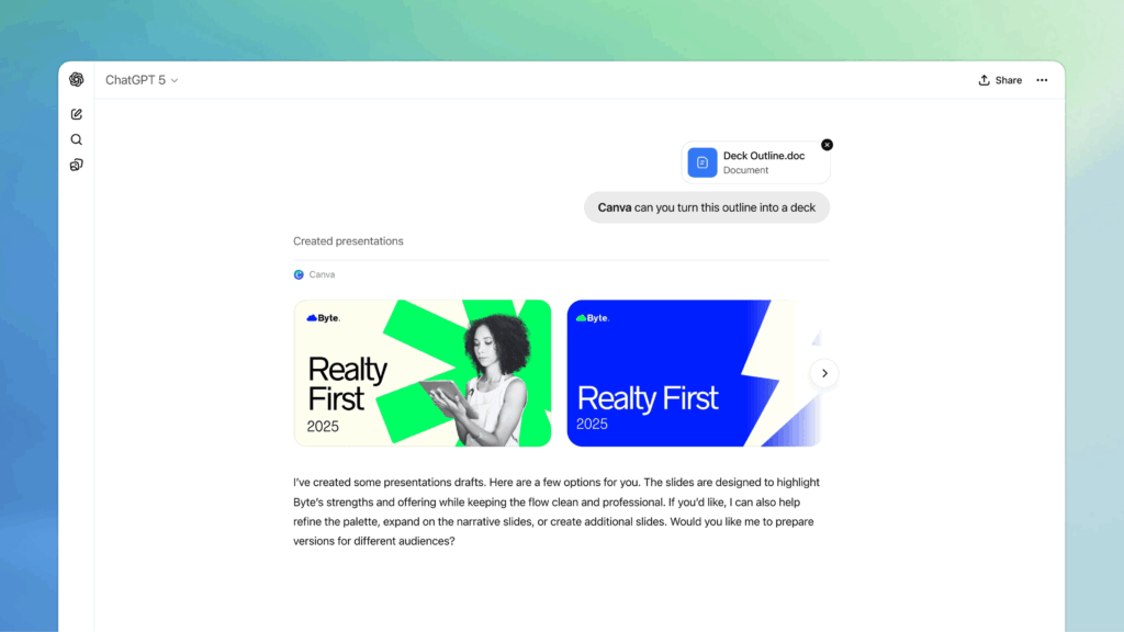 ยกตัวอย่างเช่น ให้ ChatGPT จัดการและสร้างเพลย์ลิสต์ตามอารมณ์เพลงที่เราต้องการใน Spotify ให้ และกดฟังใน Spotify ได้ทันที, โยนข้อมูลมาในแชท และ prompt บอก Canva ให้จัดทำสไลด์ให้, ให้ Booking.com หาที่พักให้ เป็นต้น โดยรวมเป็นการทำงานหลายแอปได้ในแชทเดียว ไม่ต้องสลับแอปหรือเบราว์เซอร์ไปมา