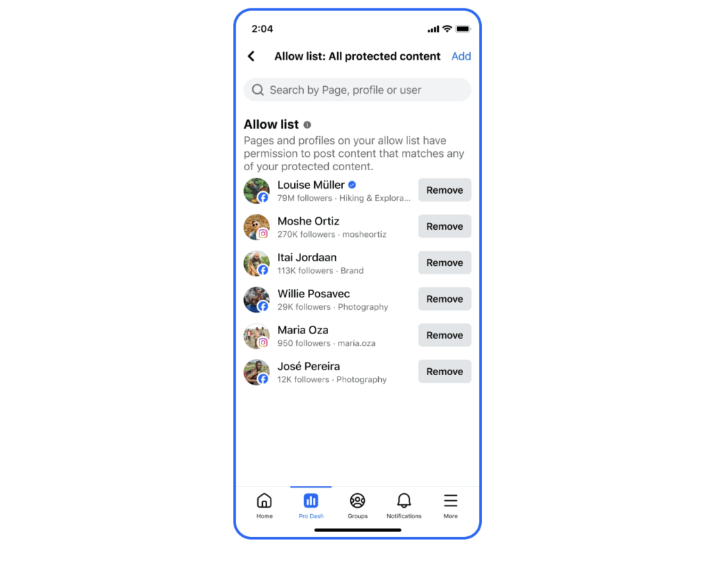 นอกจากนี้ยังมีทางเลือกตั้งค่า อนุญาตให้ช่องใดใช้คอนเทนต์ของเราได้ เจ้าของเพจและช่องที่ต้องการความคุ้มครองเนื้อหาสามารถเข้าไปสมัครได้ที่ https://www.facebook.com/rights_manager/apply