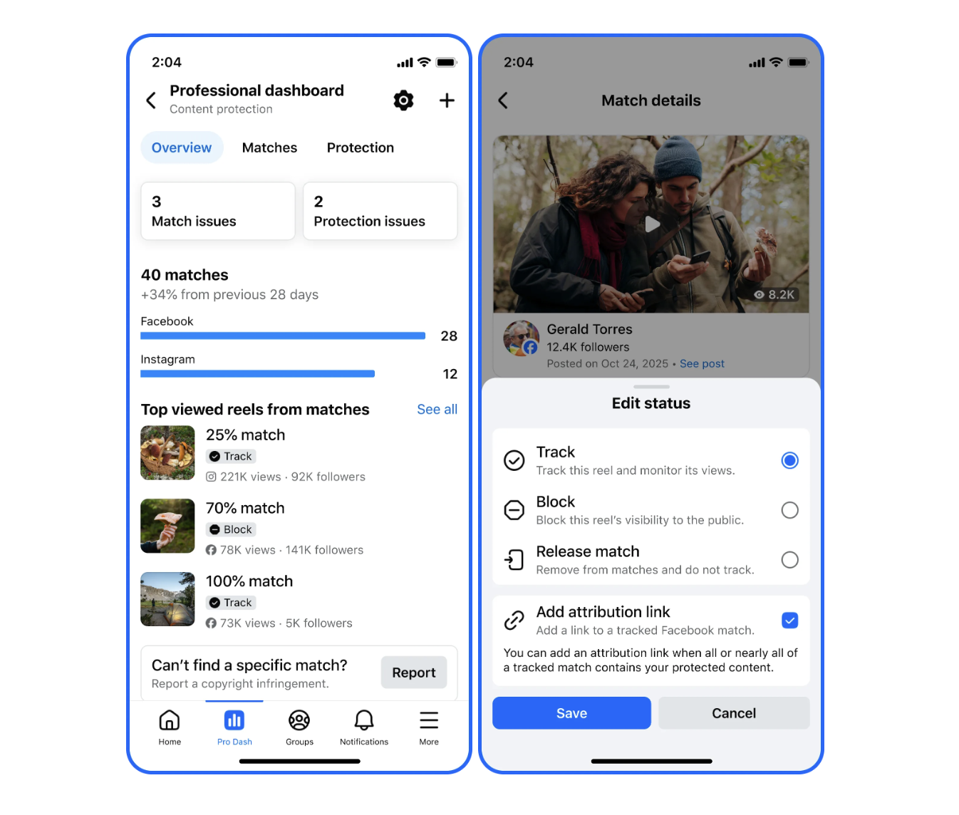 ครีเอเตอร์ต้องทำการลงทะเบียนเพื่อคุ้มครองเนื้อหา คลิป Reels ต้นฉบับทุกอันที่โพสต์บน Facebook จะได้รับการคุ้มครองโดยอัตโนมัติ คุ้มครองย้อนหลังไปยังคลิปก่อนหน้าได้ด้วยการเลือกแบบ manual