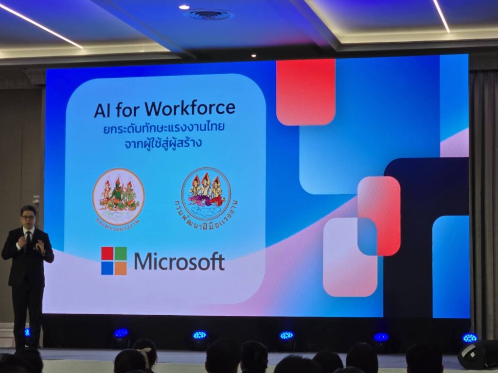 ไมโครซอฟท์ประเทศไทย และกระทรวงแรงงาน โดยกรมพัฒนาฝีมือแรงงาน ประกาศความร่วมมือภายใต้โครงการ “AI for Workforce” เปิดคอร์สเรียนทักษะเทคโนโลยีและ AI ฟรี เป้าหมายคือเร่งพัฒนาทักษะ AI และมอบประกาศนียบัตรให้กับ แรงงานไทยจำนวน 150,000 คนทั่วประเทศ