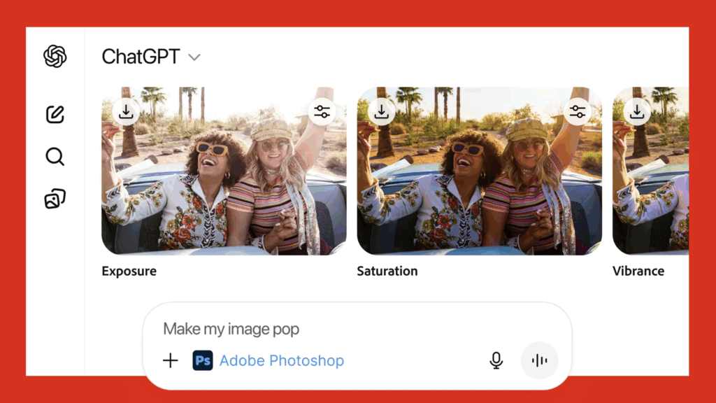 ผู้ใช้งาน ChatGPT สามารถให้ ChatGPT ช่วยปรับแสง แต่งรูปด้วยพลังของ Adobe Photoshop ได้โดยตรงจากในแอปแชท เริ่มจากอัปโหลดรูป เขียน prompt และเมนชั่นถึง Photoshop เพื่อให้แต่งรูป