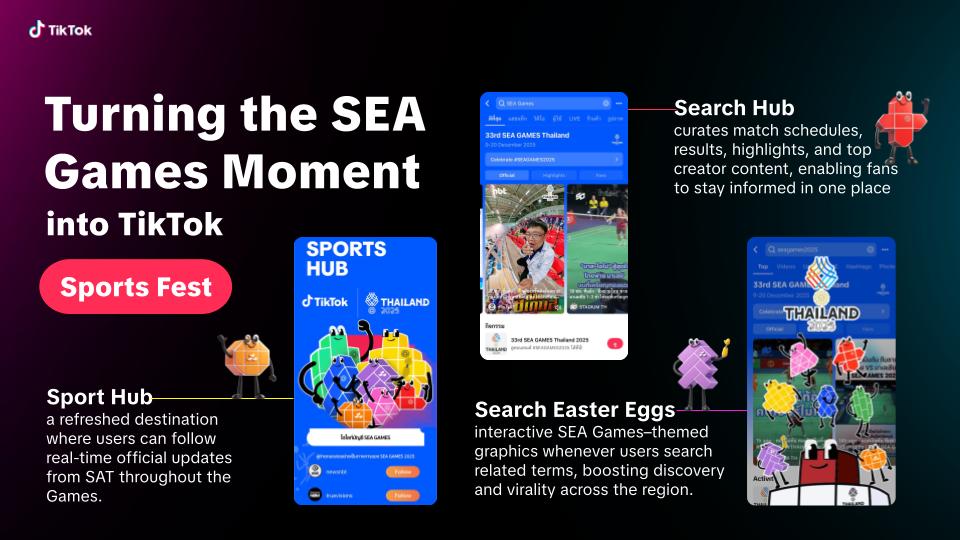 ครีเอเตอร์เองก็สามารถแจ้งเกิดได้จากการทำคอนเทนต์กีฬา ซึ่งรวมถึงสื่อกีฬาและนักวิเคราะห์มืออาชีพ ซึ่งกำลังเพิ่มขึ้นอย่างรวดเร็วบน TikTok ในไทยเอง แฮชแท็ก #TikTokการกีฬา (#TikTokSport) มียอดรับชมรายเดือนทะลุ 2.3 หมื่นล้านครั้ง ซึ่งจากตัวเลขทั้งหมดทำให้ TikTok มองว่าคุ้มค่าที่จะต่อยอดสร้าง Sport Hub และโปรเจกต์ TikTok SEA Club House และกิจกรรม TikTok Sport Fest ศูนย์กลางการสร้างสรรค์คอนเทนต์และกระตุ้นการมีส่วนร่วมตลอดการแข่งขัน SEA Games 2025