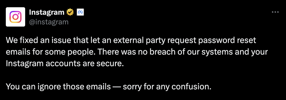 เราได้แก้ไขปัญหาที่ทำให้บุคคลภายนอกสามารถขออีเมลรีเซ็ตรหัสผ่านสำหรับผู้ใช้ Instagram บางรายได้ เราขอยืนยันว่าไม่มีการละเมิดระบบของเรา และบัญชี Instagram ของทุกคนยังคงปลอดภัย ผู้ใช้สามารถละเว้นอีเมลเหล่านี้ได้ และเราขออภัยในความสับสนที่อาจเกิดขึ้น”