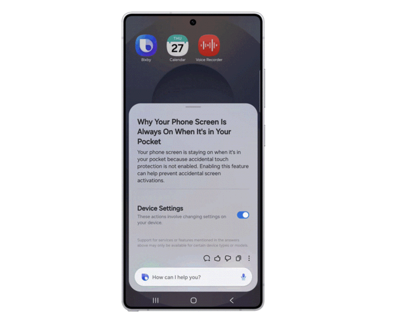 เราสามารถสั่งงานหรือถาม Bixby ให้ช่วยตั้งค่ามือถือให้ ยกตัวอย่างเช่นพิมพ์ “I don’t want the screen to time out while I’m still looking at it.” หรือฉันไม่อยากให้หน้าจอดับเมื่อฉันกำลังมองจออยู่ Bixby ก็จะเปิดเมนู ‘Keep Screen on While Viewing’ ขึ้นมาให้โดยที่เราไม่ต้องเข้าไปหาเอง