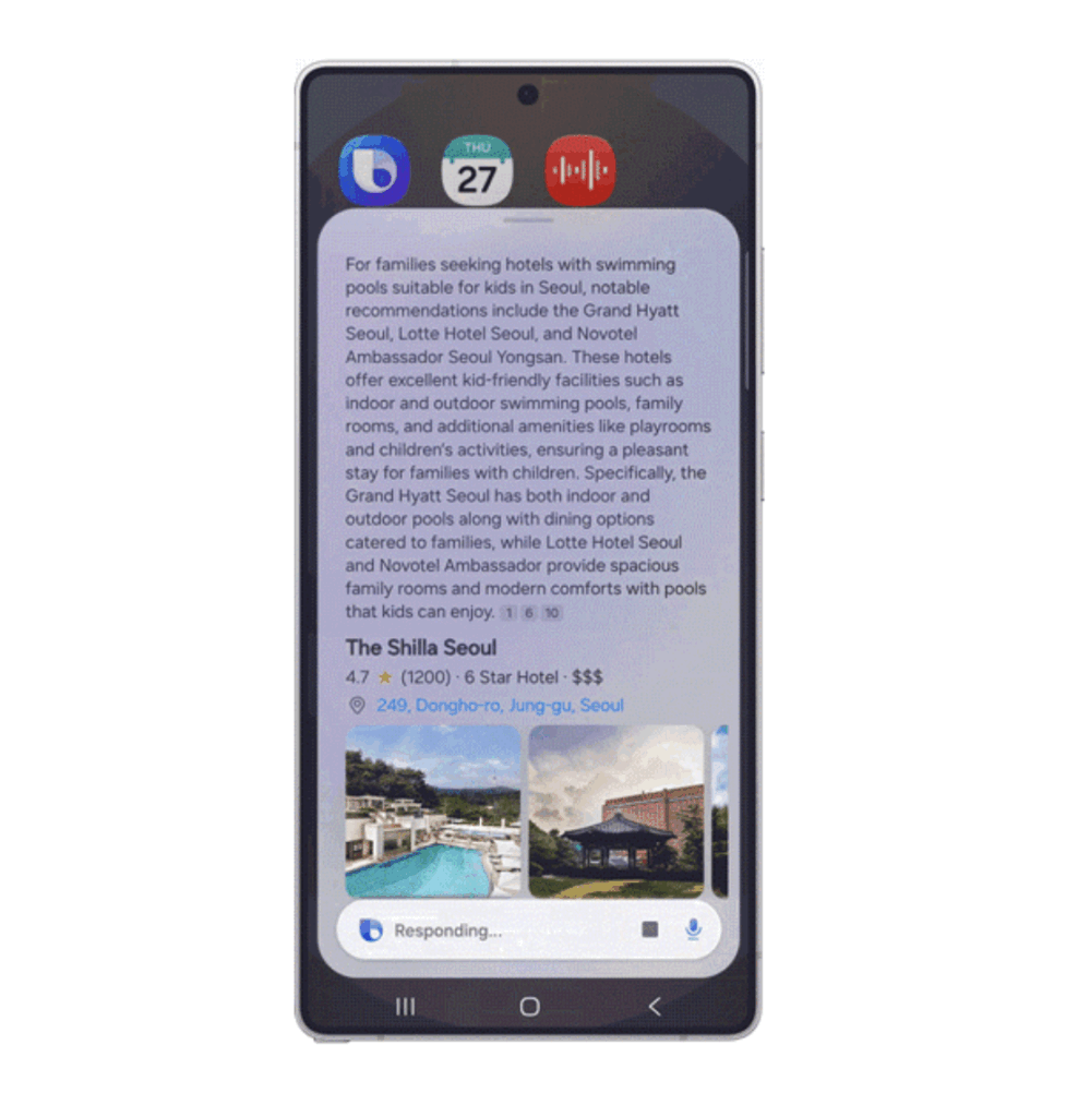 Bixby รองรับ real-time web search หรือการค้นหาข้อมูลเรียลไทม์จากอินเทอร์เน็ต แสดงข้อมูลบนหน้าอินเทอร์เฟซของ Bixby ให้ประสบการณ์เหมือนใช้งานแชทบ็อท Gemini, ChatGPT ฯลฯ